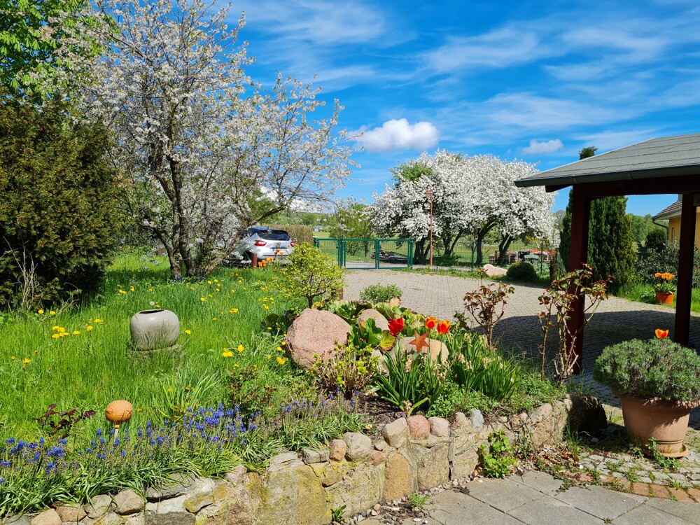 Ein besonderes Highlight ist der idyllische große Obstgarten nahe zum Feldrand (verschiedene Äpfel, Birne, Pflaume und Kirschbäume, Obststräucher, Rosen etc.) mit seinem liebevoll gestalteten Baumhaus – eine Oase der Fantasie für Jung und Alt.